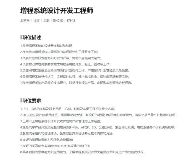 雖然上述消息并未得到小米汽車官方證實,但小米招聘官網顯示,小米正在招聘增程系統設計開發工程師、燃油系統工程師、排氣系統工程師等人才。