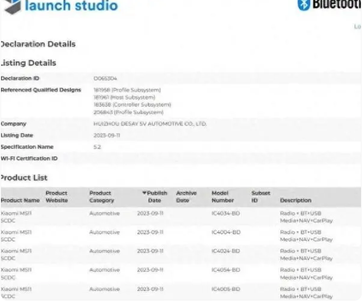 近日,藍牙技術聯盟SIG數據庫顯示,代號為MS11的小米首款汽車已通過認證,將支持藍牙5.2、收音機、USB媒體,最關鍵的是其還將支持蘋果CarPlay。